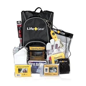 Product Description : From the ManufacturerEach Life Gear "Day Pack" Emergency Survival Kit Backpack contains the basic emergency supplies . Whether it be hiking through the foothills or evacuating your home in an emergency, the Life Gear Grab n Go Backpack gives you peace of mind, wherever you go. Aside from being a fully functional backpack, this Survival Kit has your needs covered in case of emergencies with an assortment of emergency needs and utilities. The emergency kit includes a first aid kit, directional compass, all weather poncho, signaling mirror, writing pad and pen, waterproof document/cash bag, signaling whistle, thermal blanket, leather working gloves, Respirator Mask, (4 in 1 LED Glow Stick / LED Flashlight / Flasher and Whistle), and hygiene kit. This highly functional everyday use bug out bag features quick access to items. Life Gear products provide attractive and useful features that can be used daily while having components that can be potentially life saving during time of need. This survival kit, in a handy grab n go backpack, can be stored at home, in the car, boat, RV, at school, or at the office. Just ad the Life Gear 3 day supply of food and water and this compact emergency kit backpack is an all-inclusive emergency preparedness kit. Designed for any type of emergency, including hurricanes, tornados, earthquakes, blackouts and floods. Planning ahead can significantly help protect you and your loved ones. The supplies in your backpack from Life Gear will help you stay a step ahead in being prepared for an unexpected disaster or emergency. Life Gear -Prepare for Life. Product Description : Life Gear is a brand founded upon the principle of innovating everyday products so they may include features with life saving potential. Working with disaster preparedness agencies and drawing inspiration from worldwide emergencies we have created a brand name that is synonymous with safety, reliability, and family fun. When life needs gear, we will be there. Life Gear's durable and provide attractive and useful features that can be used daily while having components that can be potentially life saving during time of need while traveling, boating, hiking, camping or simply commuting to and from work. You can recycle your batteries through Life Gear